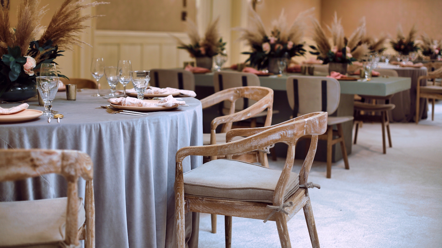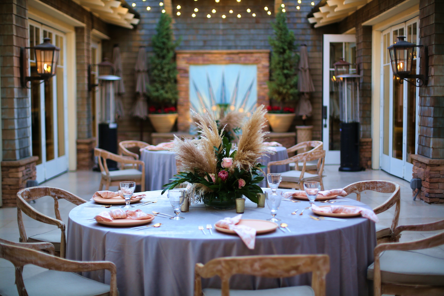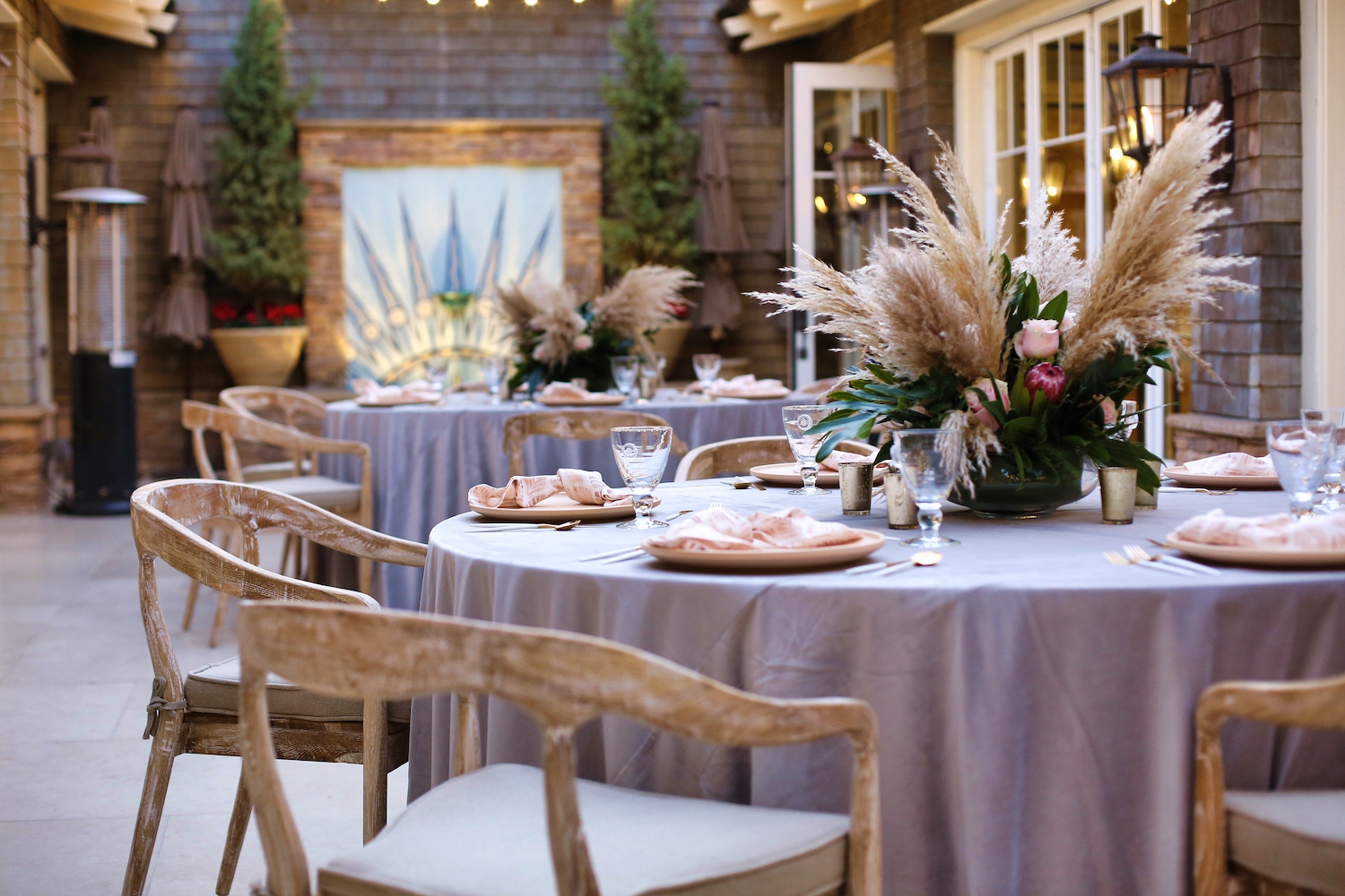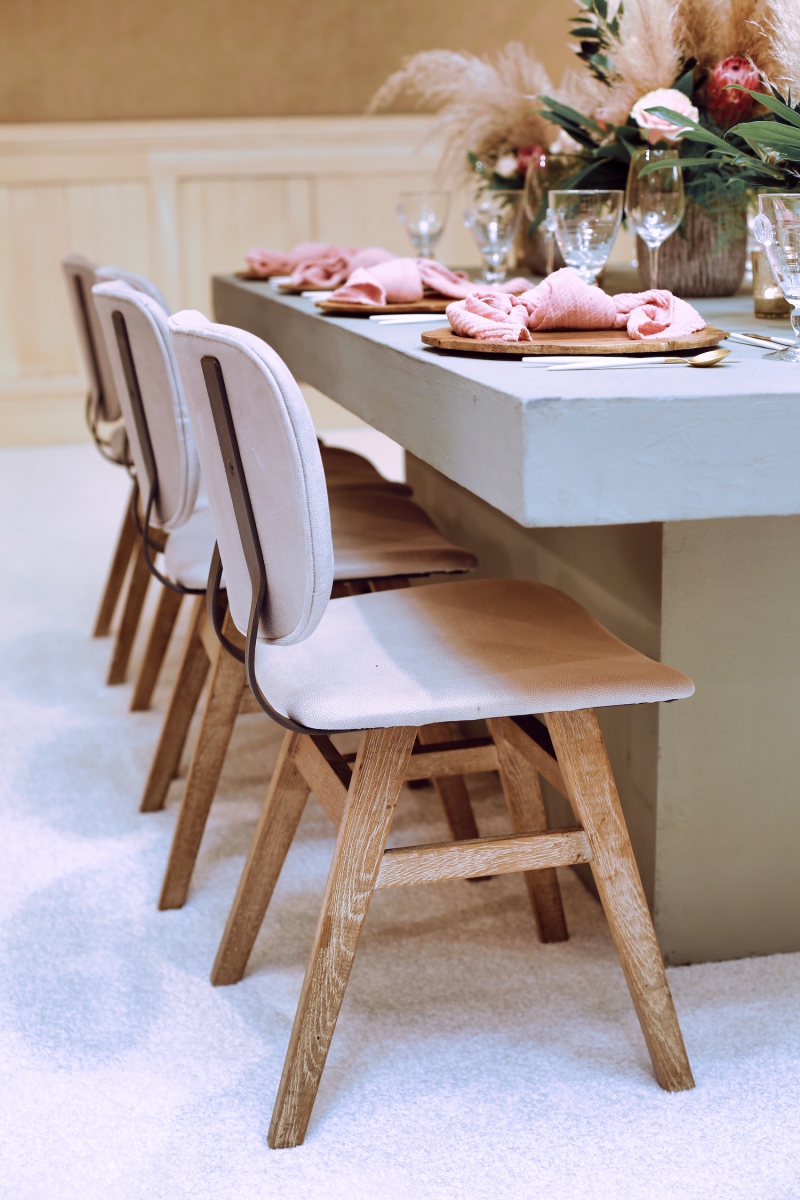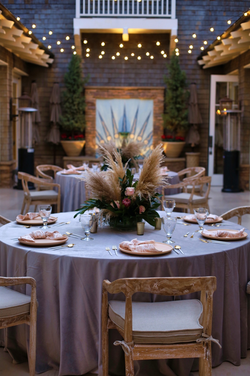 For this corporate event at Montage Laguna Beach, we mixed modern design with boho elements and a touch of tropical by bringing in cement tables, white carpeting for the ballroom, wood chairs, soft blush accents and tropical greenery.