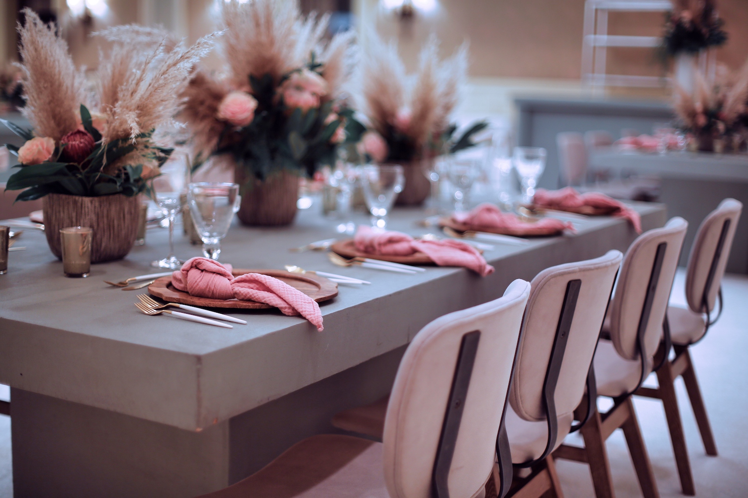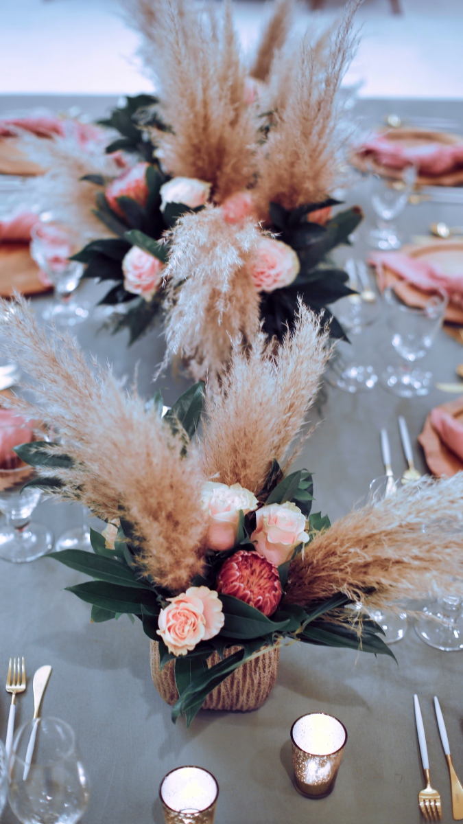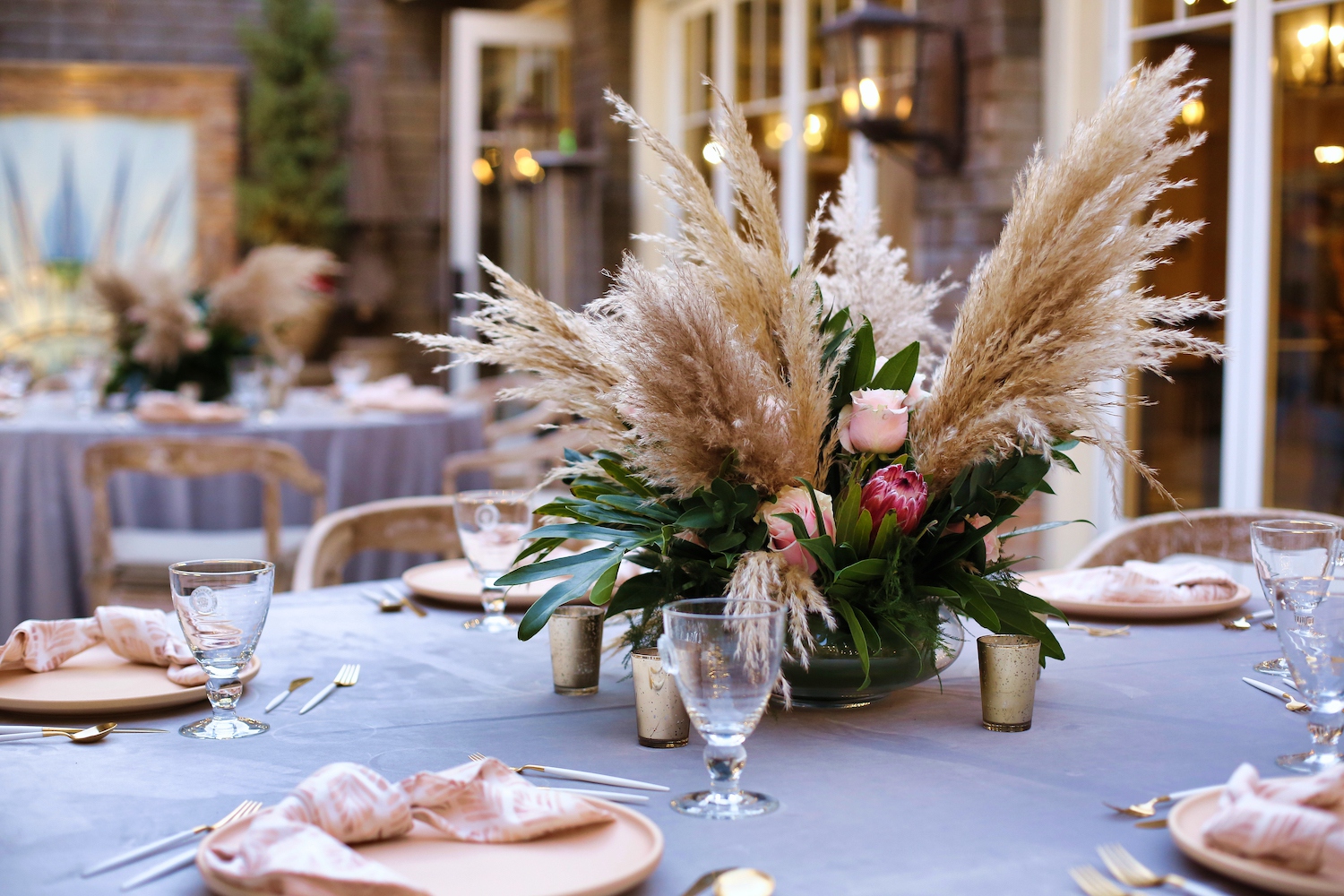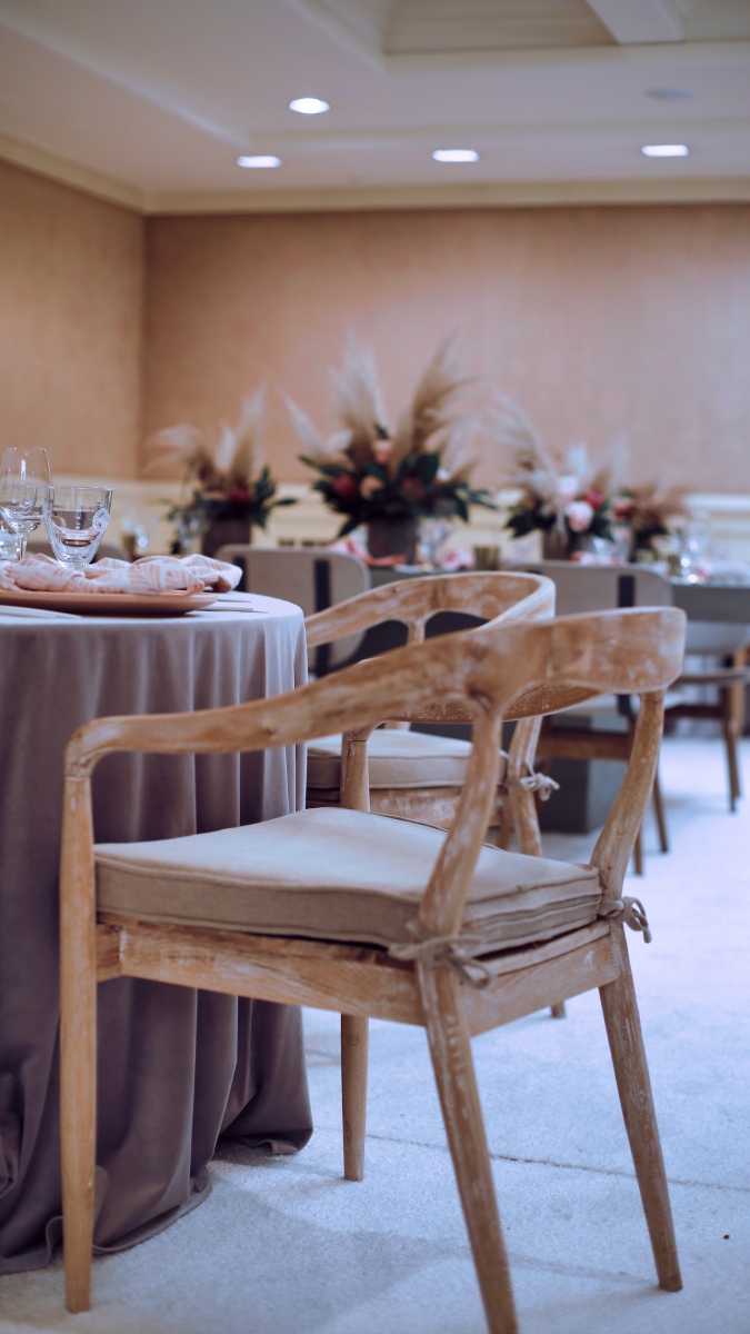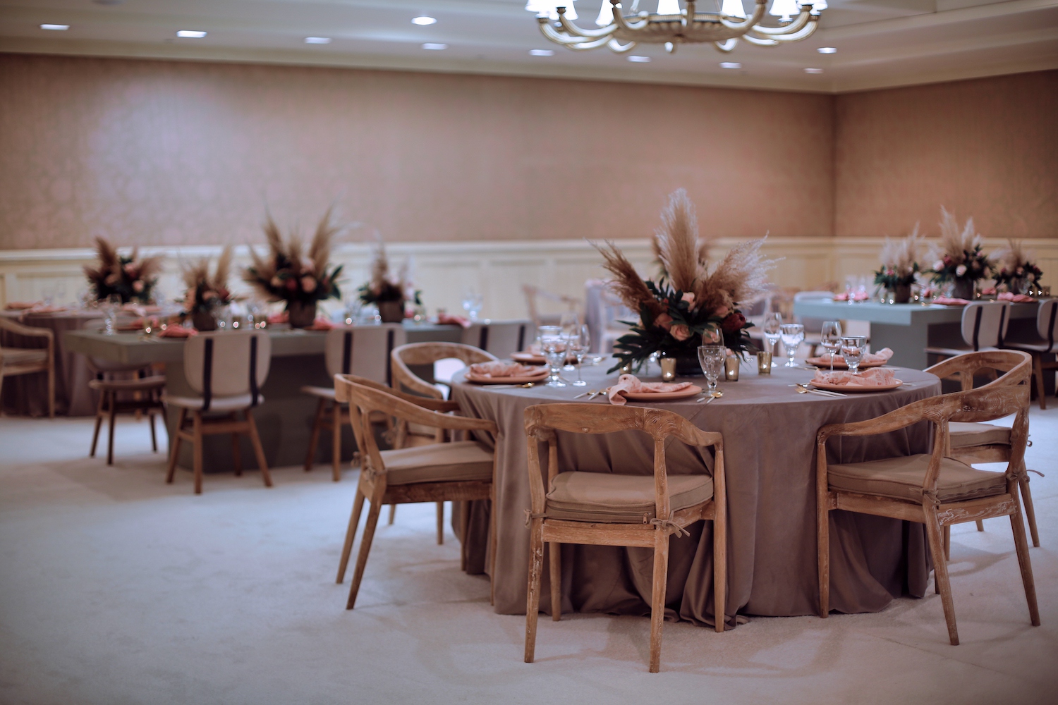 For this corporate event at Montage Laguna Beach, we mixed modern design with boho elements and a touch of tropical by bringing in cement tables, white carpeting for the ballroom, wood chairs, soft blush accents and tropical greenery.
