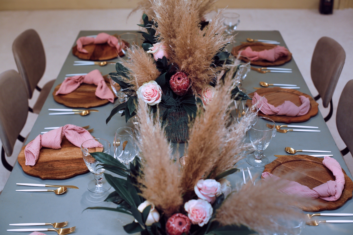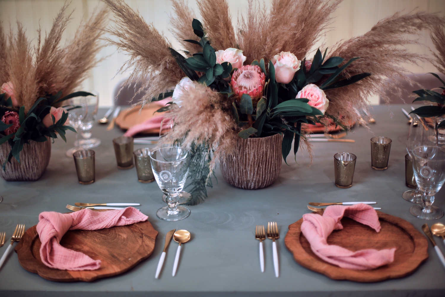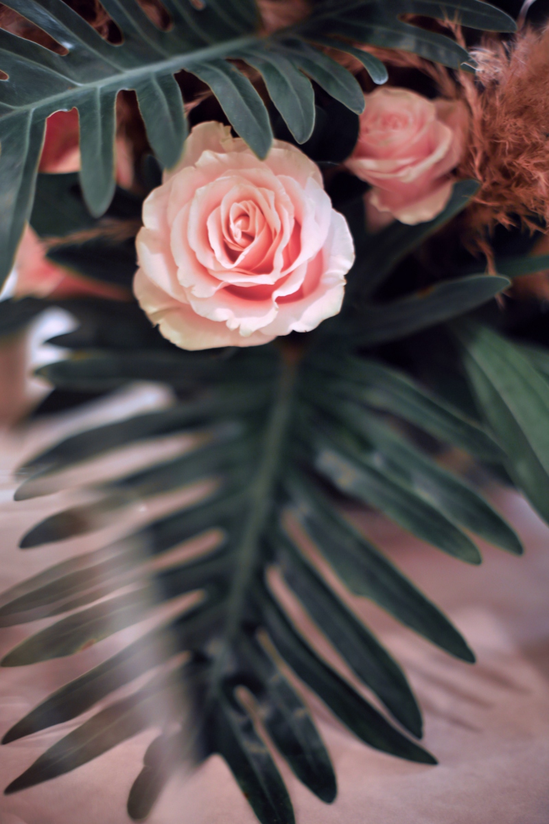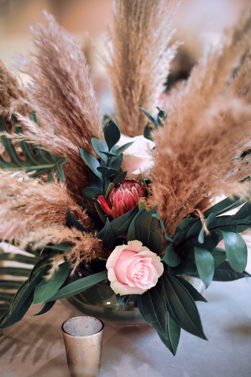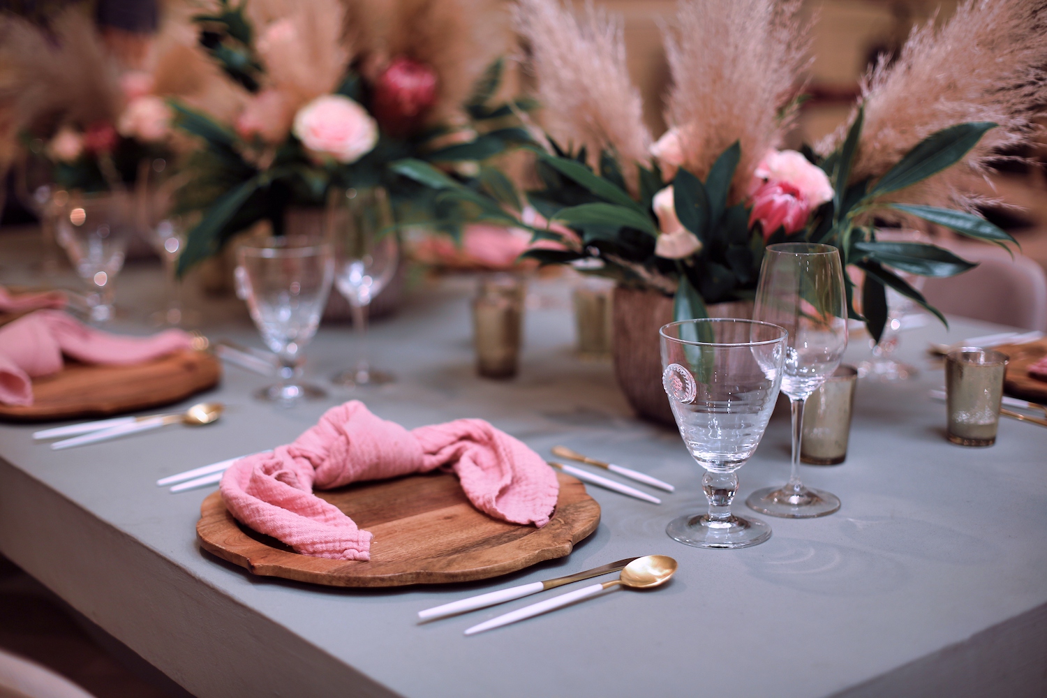 For this corporate event at Montage Laguna Beach, we mixed modern design with boho elements and a touch of tropical by bringing in cement tables, white carpeting for the ballroom, wood chairs, soft blush accents and tropical greenery.